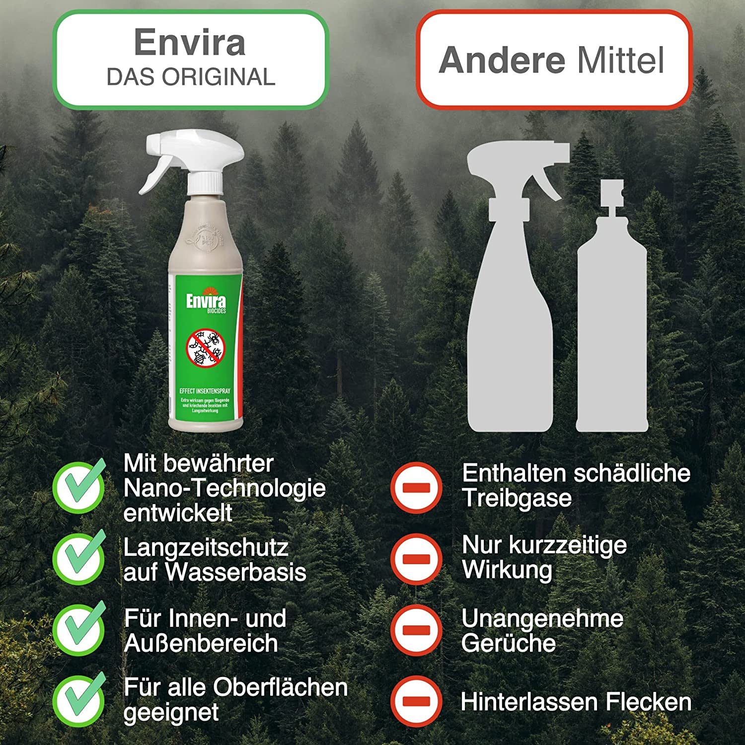 Bei sachgemäßer Anwendung wehrt Envira Effect Insektenspray fliegende und kriechende Insekten aller Art über Monate im trockenen Innenbereich ab. Envira ist auch für Tierlager geeignet (nicht direkt auf das Tier sprühen!). Selbst empfindliche Oberflächen wie Leder, Möbel, Teppiche können besprüht werden (vor Anwendung ggf. an unauffälliger Stelle testen).